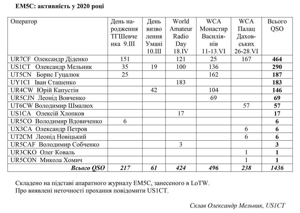 Зв’язки з EM5C 25-26 вересня 2020 року зараховуються на дипломи “Фортеці світу” – World Castle Award, WCA UR-00004 і “Замки України”, UCFA CH-003.