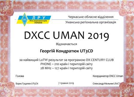 Учасникам конкурсу було вручено сертифікати «DXCC UMAN – 2019» за найвищі LoTW-результати за програмою диплому DXCC.