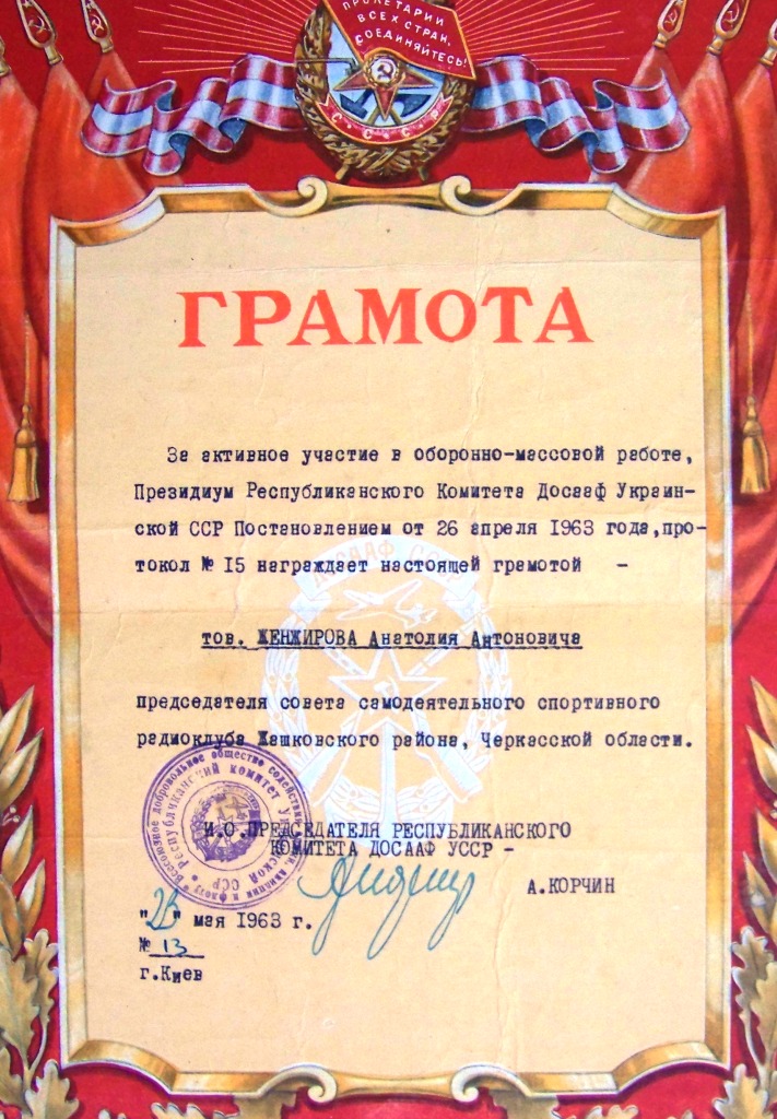 Грамота ЦК ДТСААФ України А.А.Женжирову за організацію самодіяльного спортивного радіоклубу (1963 р.)