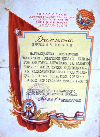 Диплом А.А.Женжирову за перше місце в перших змаганнях короткохвильовиків Черкащини (1960 р.)